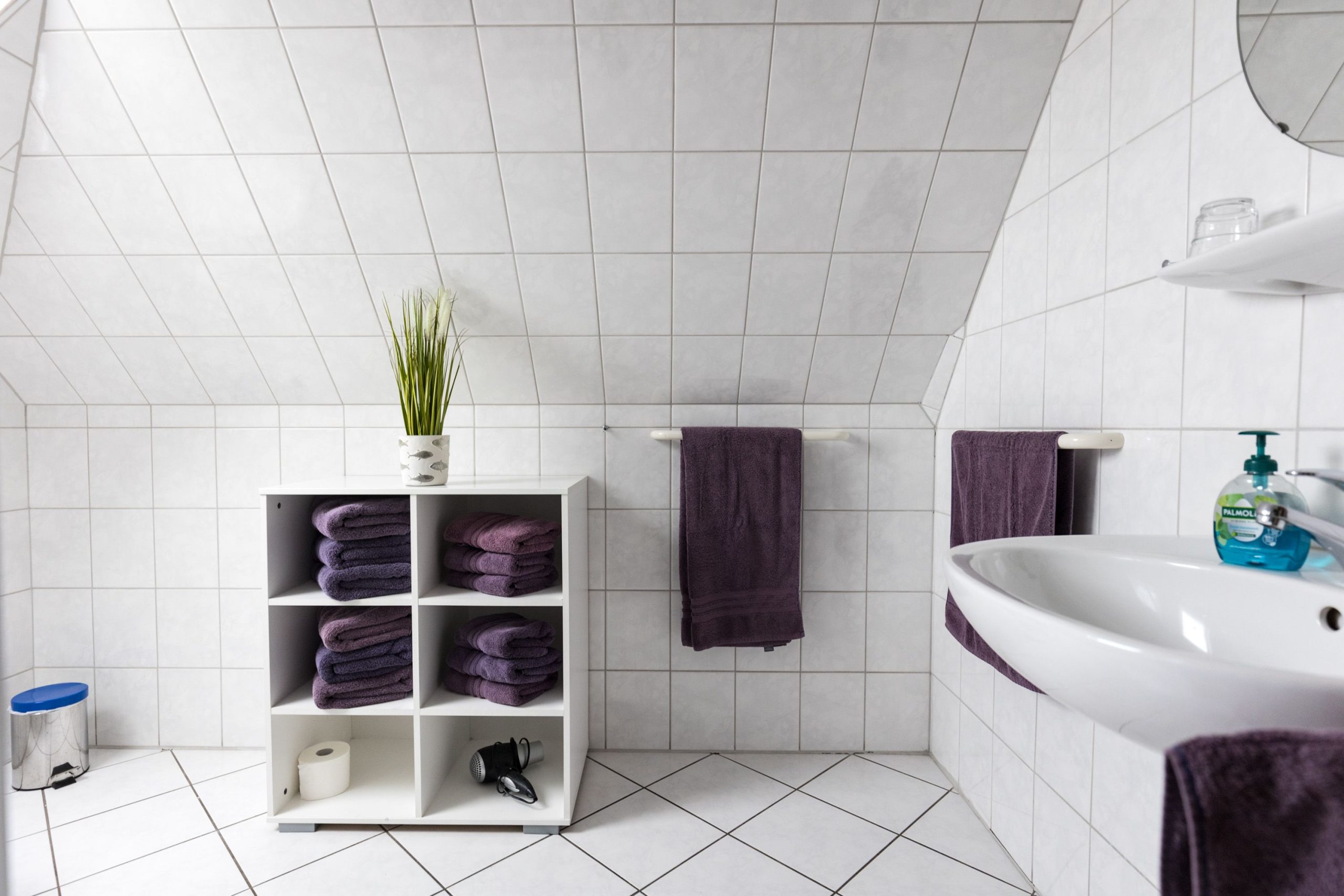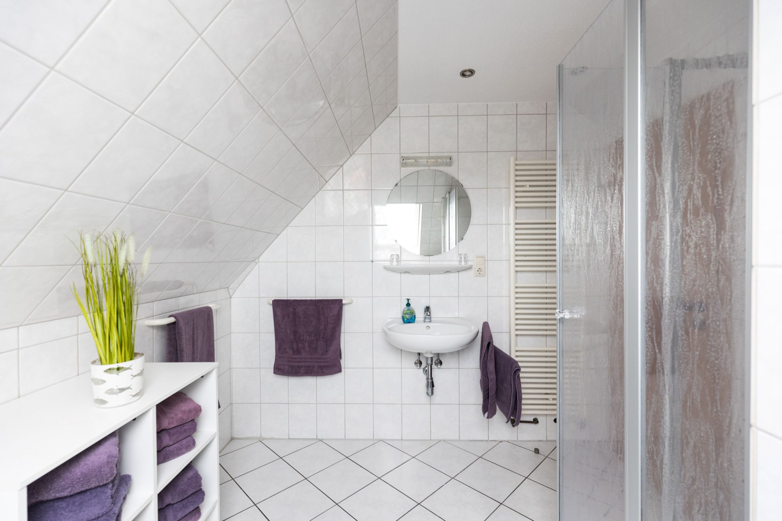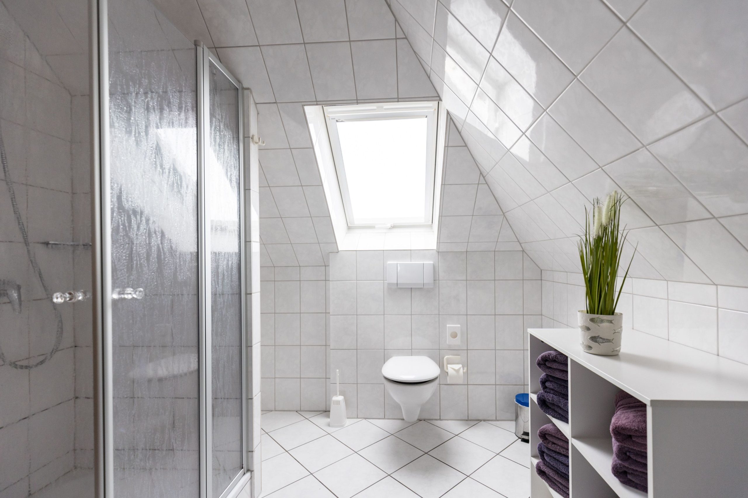 Das Badezimmer verfügt über eine Dusche, einen Kosmetikspiegel und Handtücher. Zusätzlich stehen Waschmaschine und Trockner zur gemeinschaftlichen Nutzung bereit.