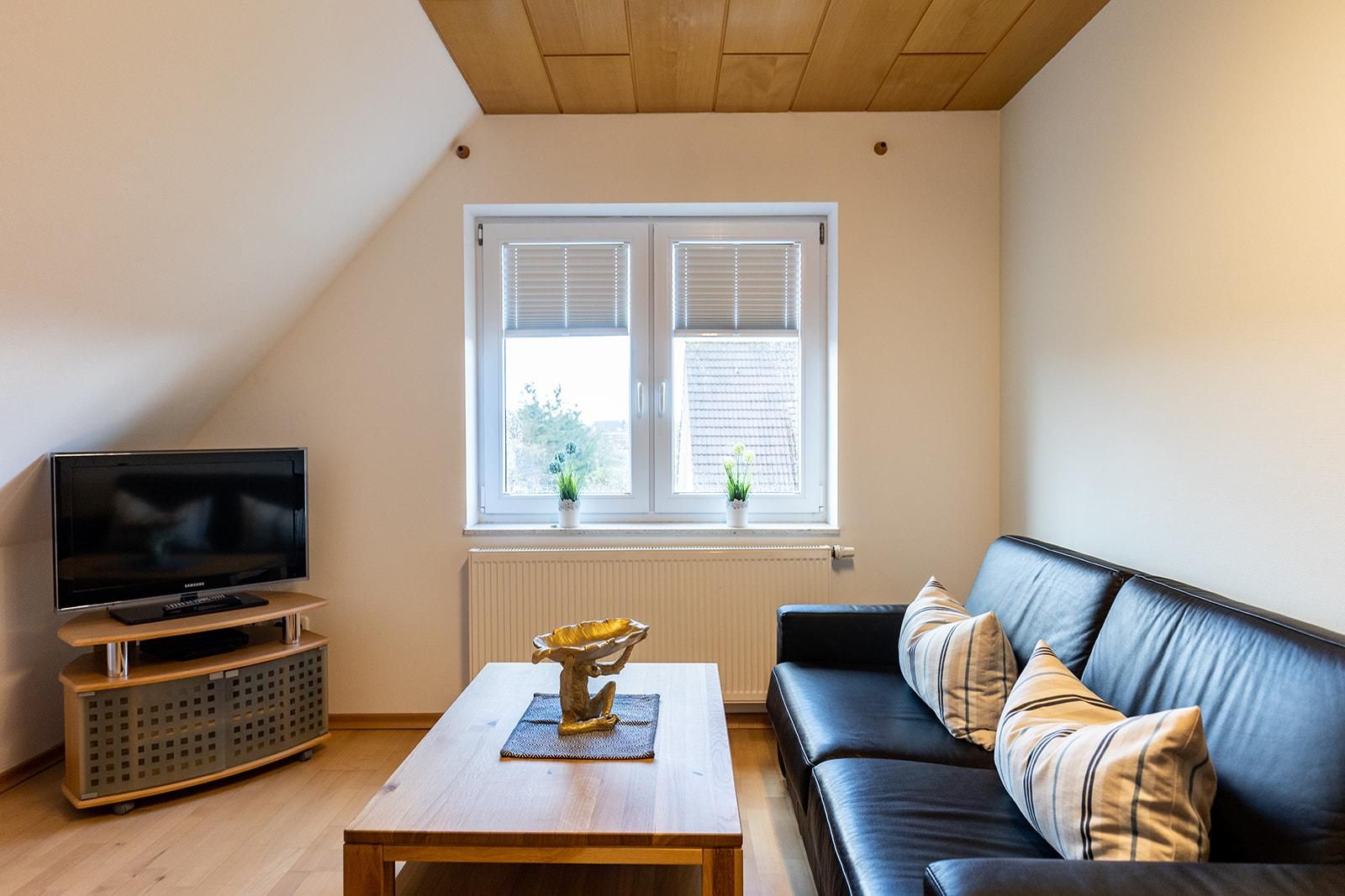 Der großzügige Wohnbereich lädt mit Sofaecke und Esstisch zum Verweilen ein – ideal für gesellige Abende mit Filmen, Spielen oder entspanntem Beisammensein. Dank WLAN und Flachbild-TV bleibst du stets gut unterhalten und informiert.