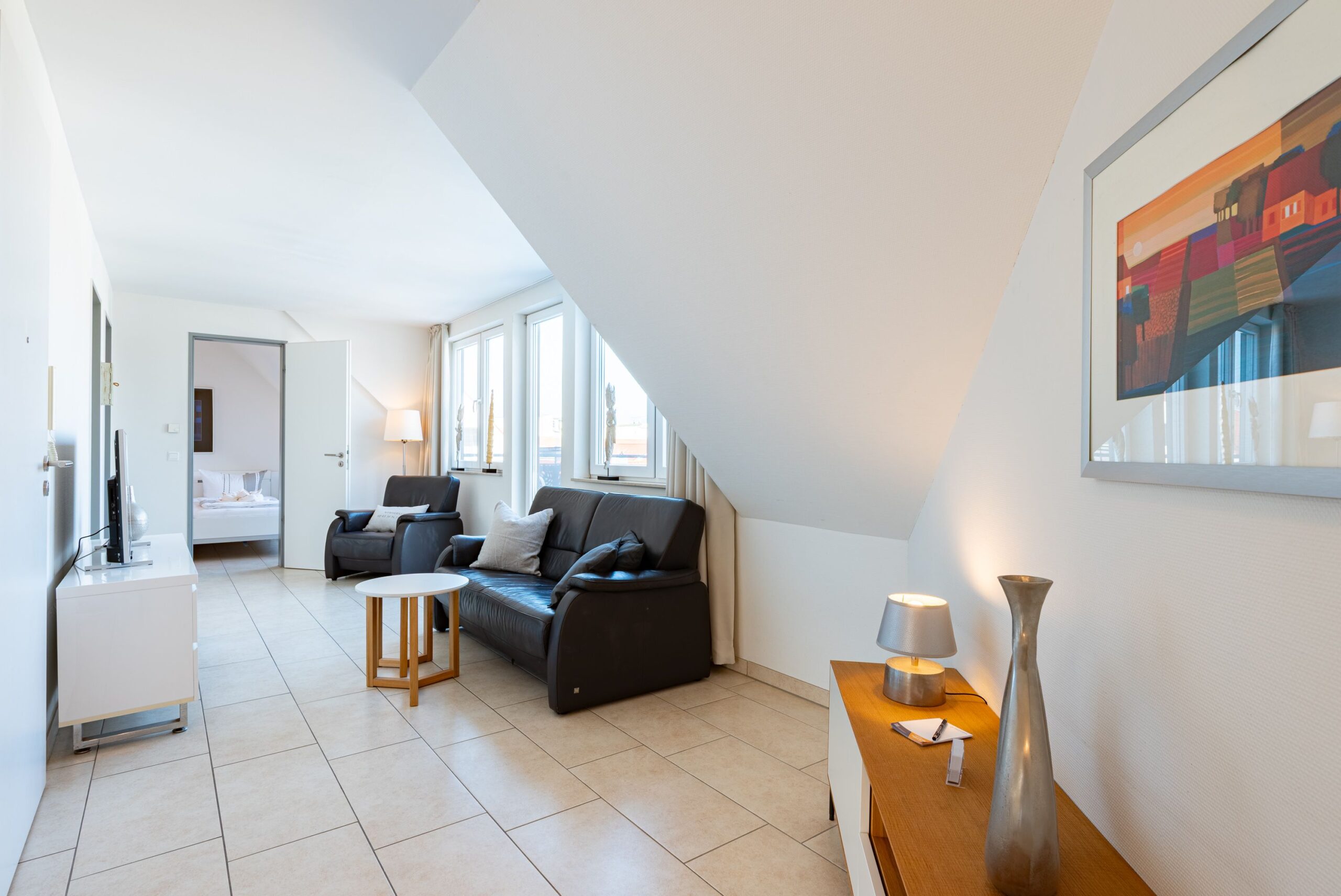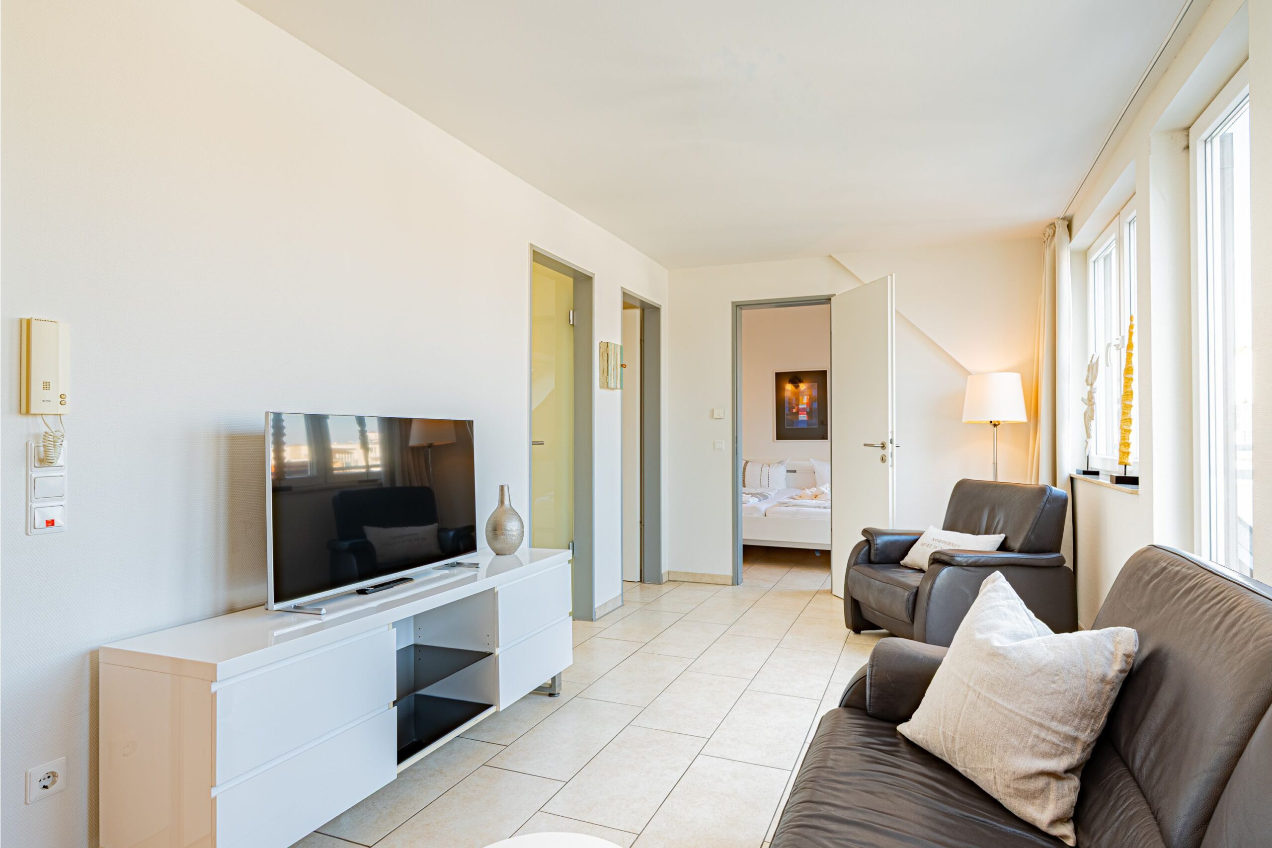 Der Wohnbereich ist gemütlich mit Sofaecke, Sofa und Sessel eingerichtet. Für Unterhaltung und Komfort stehen Dir ein TV mit Kabelanschluss sowie WLAN zur Verfügung. Fliesen in Wohn- und Schlafbereichen sorgen für ein gepflegtes Wohngefühl, Heizung und Fußbodenheizung für angenehme Temperaturen. Praktische Ausstattungsdetails wie Garderobe, Kommode, Ganzkörperspiegel, Wäscheständer, Staubsauger und Rauchmelder sind ebenfalls vorhanden.