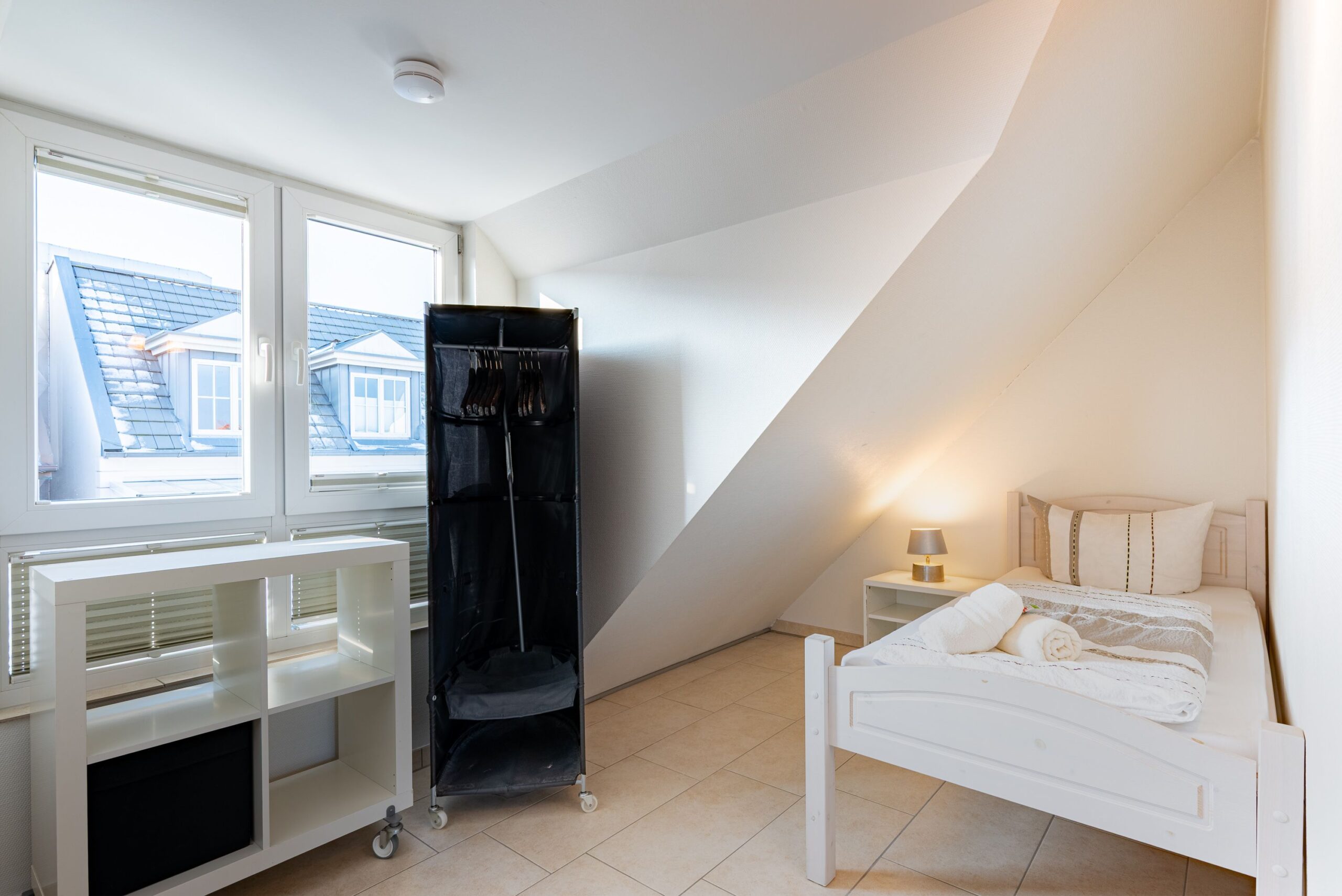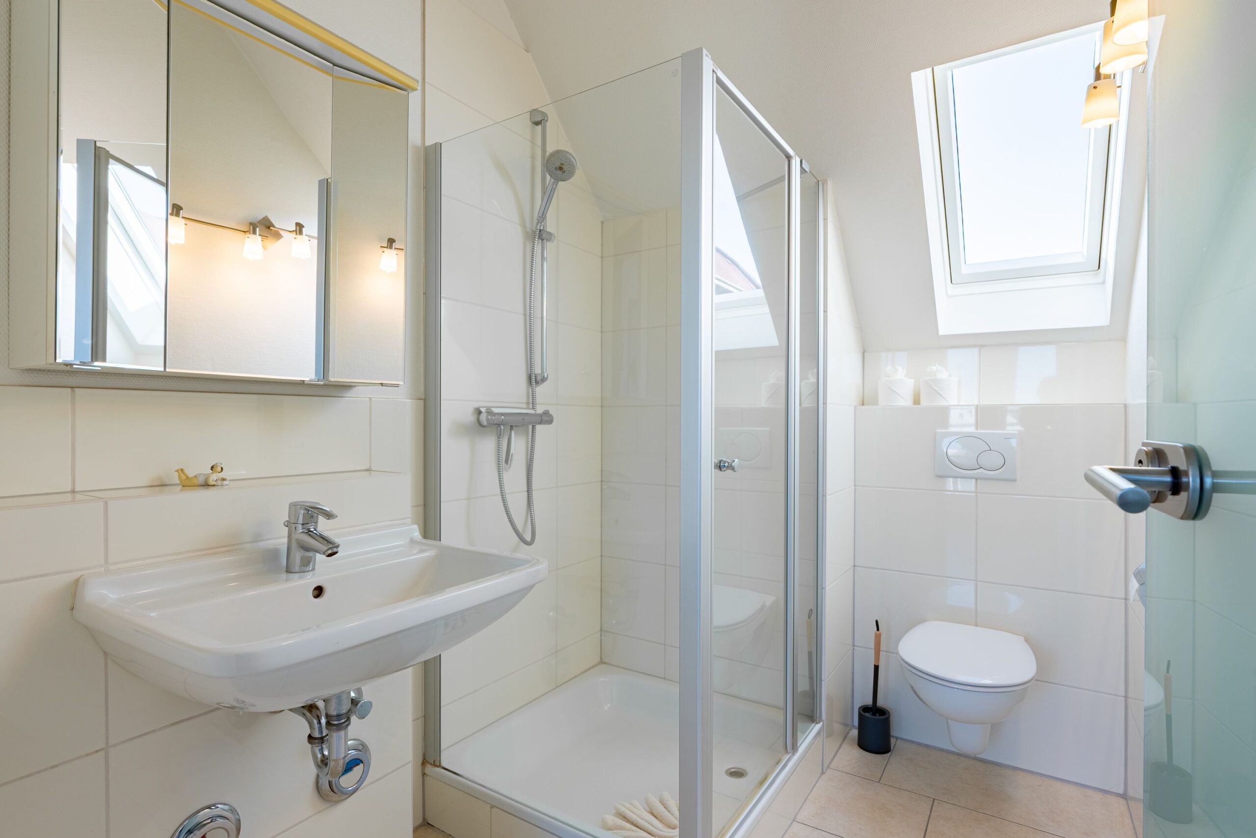 Das Badezimmer verfügt über eine Dusche, WC, Waschbecken, Spiegel, Fenster und Haartrockner. Für längere Aufenthalte kannst Du Waschmaschine und Trockner gemeinschaftlich nutzen. Auf dem Balkon laden Gartenmöbel und Windschutz zum Entspannen ein. Ein Supermarkt befindet sich in der Nähe und ist bequem erreichbar.
